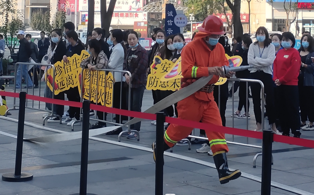8:15分商场火警警报响起,各楼层员工手捂口鼻下蹲匍匐,安全有序的从各消防疏散通道撤离,至外广场集合观摩和参与灭火演练。市消防大队许队长对如何规范使用灭火器、消火栓等消防器材进行了详细讲解。各演练人员摩拳擦掌、跃跃欲试,随着工作人员点燃油池,随机抽取的灭火队员们拿起干粉灭火器以最快速度到达着火点,“一拔二压三对准”,各演练人员均熟悉掌握灭火器的使用方法快速灭火。随后,还开展了消火栓水带放水演练以及针对餐饮业态开展了油锅灭火演练。本次演练增加了针对南京金盛百货餐饮后厨火灾教训增加了“灭火弹”的现场演练。